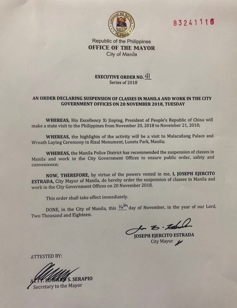 Classes in Philippine School of Business Administration – Manila are suspended tomorrow, November 20, 2018 in all levels as per Executive Order No. 41 from the Office of the Mayor, City of Manila due to the state visit of the President of the People’s Republic of China: