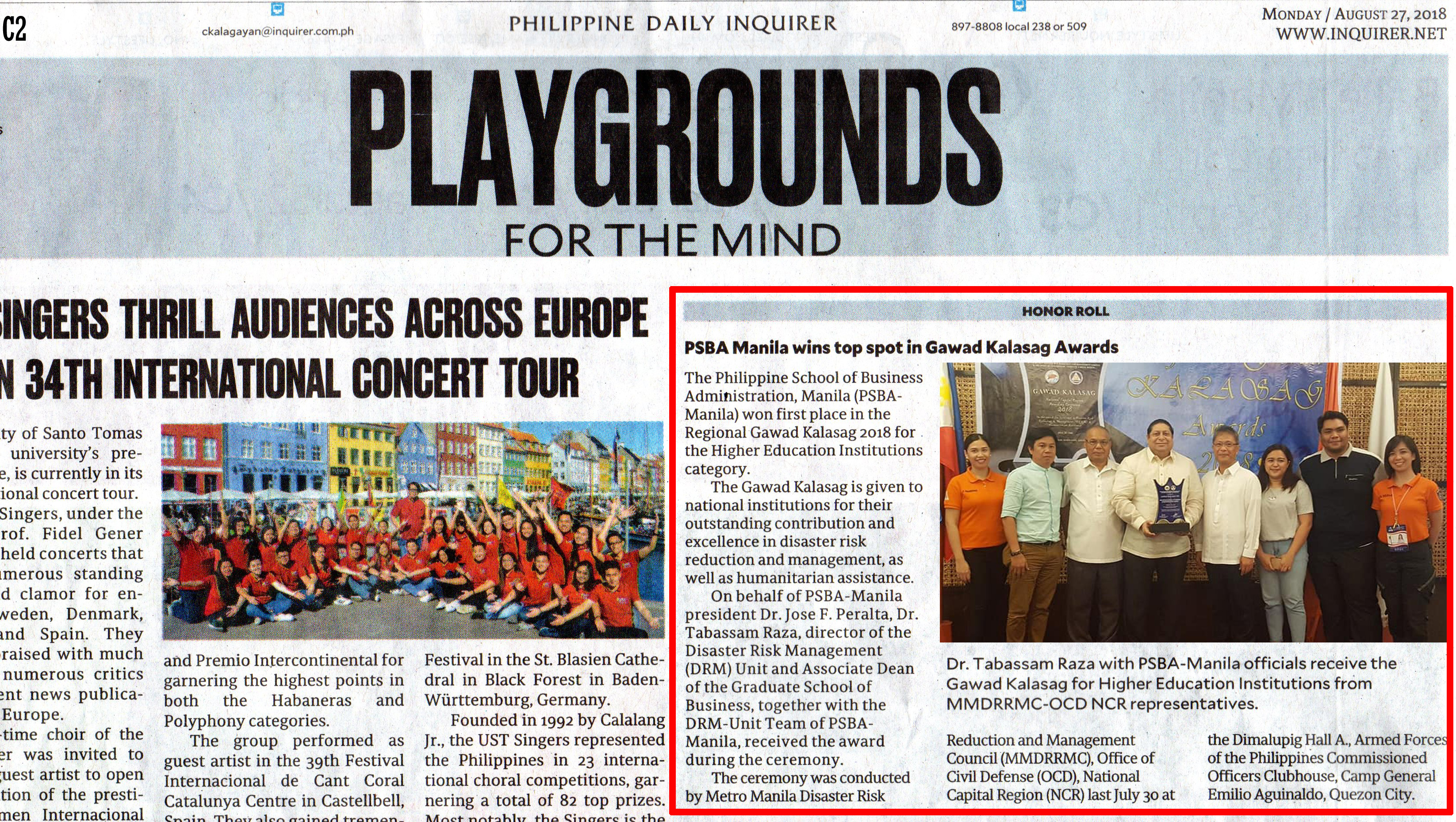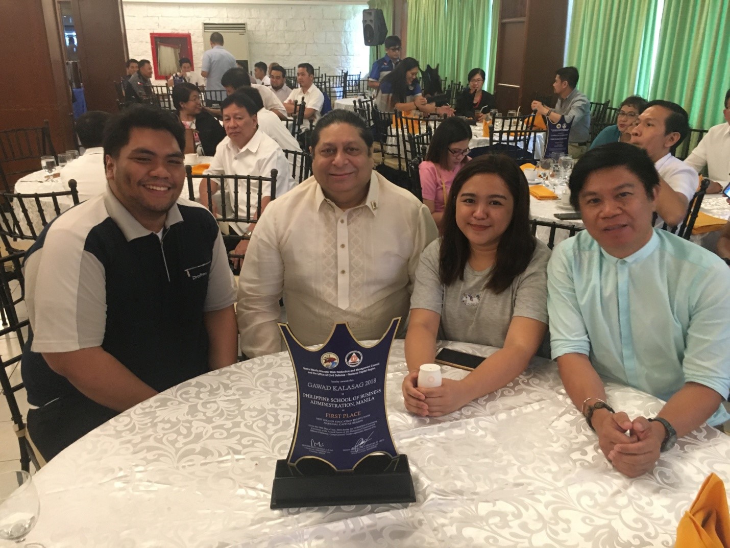 The Philippine School of Business Administration – Manila (PSBA-Manila) won First Place in the Regional Gawad KALASAG Awards 2018 for the Higher Education Institutions category. The Gawad KALASAG Award is given to National institutions for their outstanding contribution and excellence in disaster risk reduction and management, as well as humanitarian assistance. This was the first year that the Gawad KALASAG Awards had a category for Higher Education Institutions wherein PSBA-Manila took home first place for the National Capital Region (NCR).