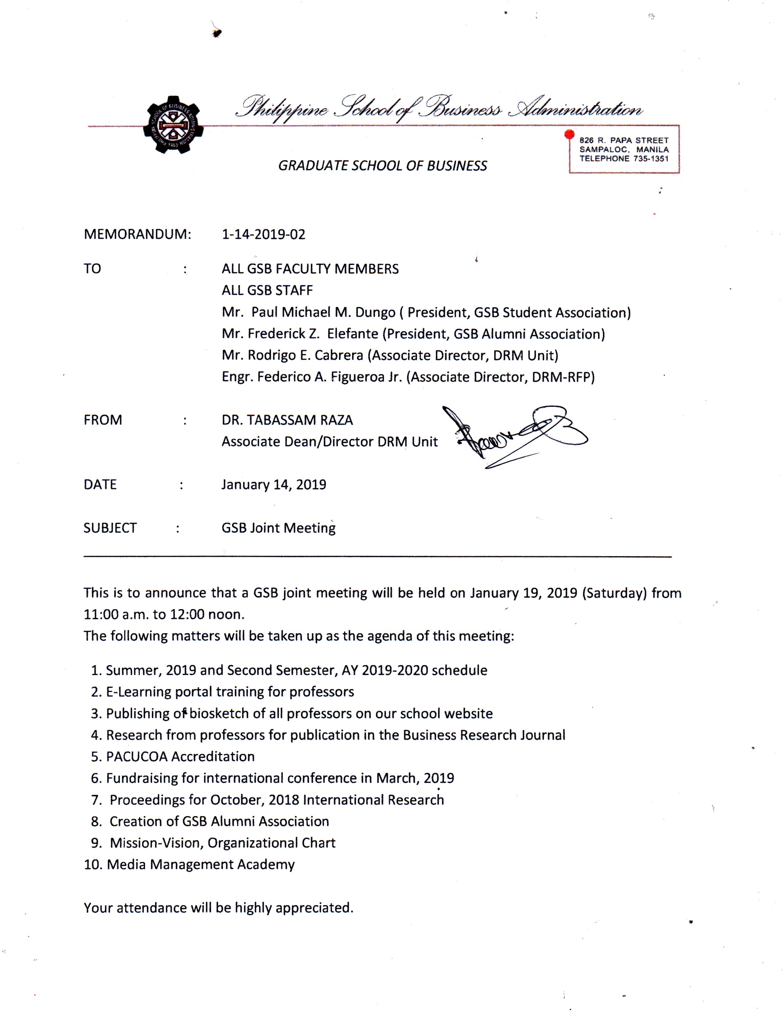 January 15, 2018 — The Philippine School of Business Administration – Manila (PSBA-Manila), Graduate School of Business (GSB) will be having a GSB Faculty joint meeting at the GSB Lounge follow by GSB Student orientation at the GSB conference room on January 19, 2019 (Saturday) from 11:00 a.m. to 04:00p.m.