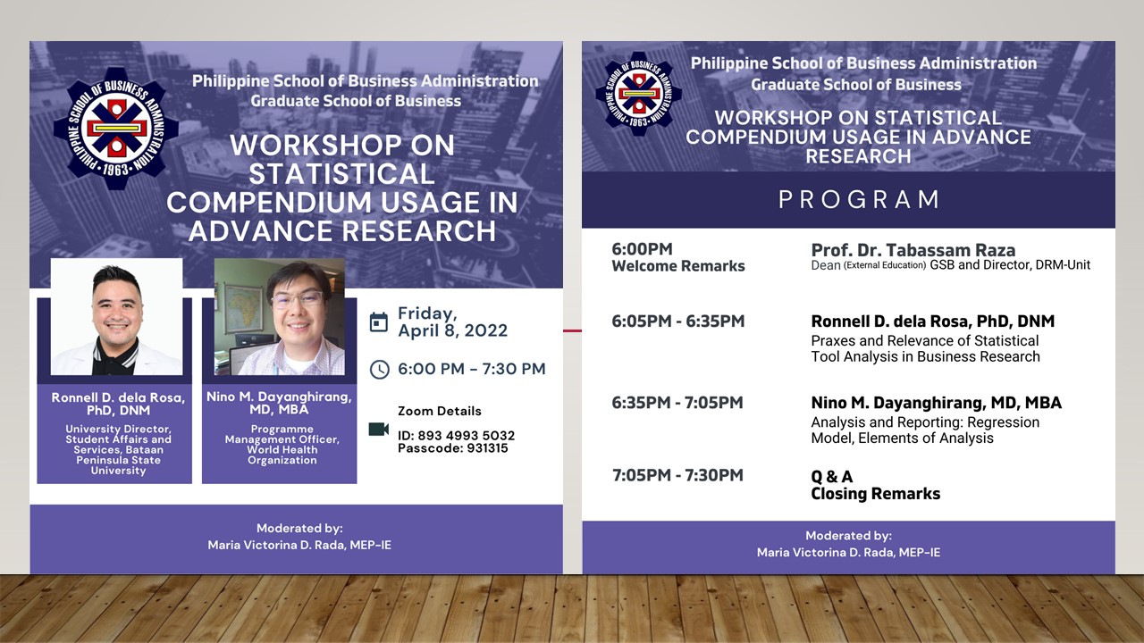 April 06, 2022 – The PSBA Manila Graduate School of Business (GSB)  would like to invite you to the webinar “Workshop on Statistical Compendium usage in Advance Research (WSCUAR)” on April 8, 2022, from 6:00 PM to 7:30 PM.